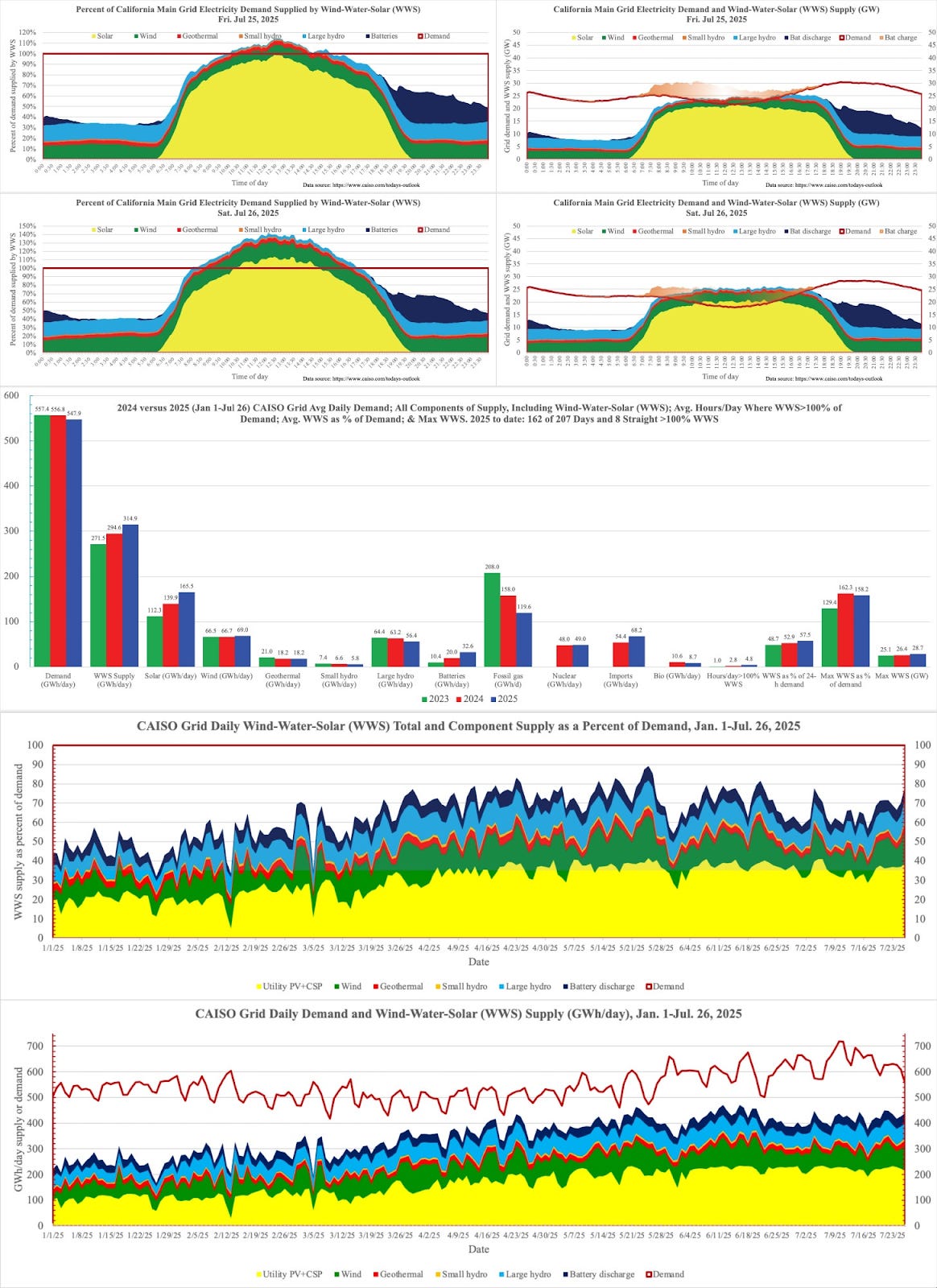In real terms, that means California is now averaging 4.7 hours per day powered by 100% clean electricity — up from just one hour per day in 2023. So far in 2025, WWS has supplied 57.5% of California’s electricity demand, compared to 48.7% two years ago. This is what serious decarbonization looks like.