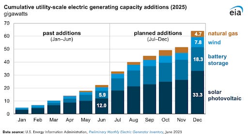 Despite federal sabotage, resistance from right-wing extremists in the states, foot-dragging by inherently conservative utilities, and all the everyday complexity of permitting and construction, 12 GW of new utility-scale solar was added in the first half of 2025, and another 21 GW is expected by December. It’s just more evidence that it’s very hard for politics — even fanatical politics — to stop a market economy from making rational decisions.