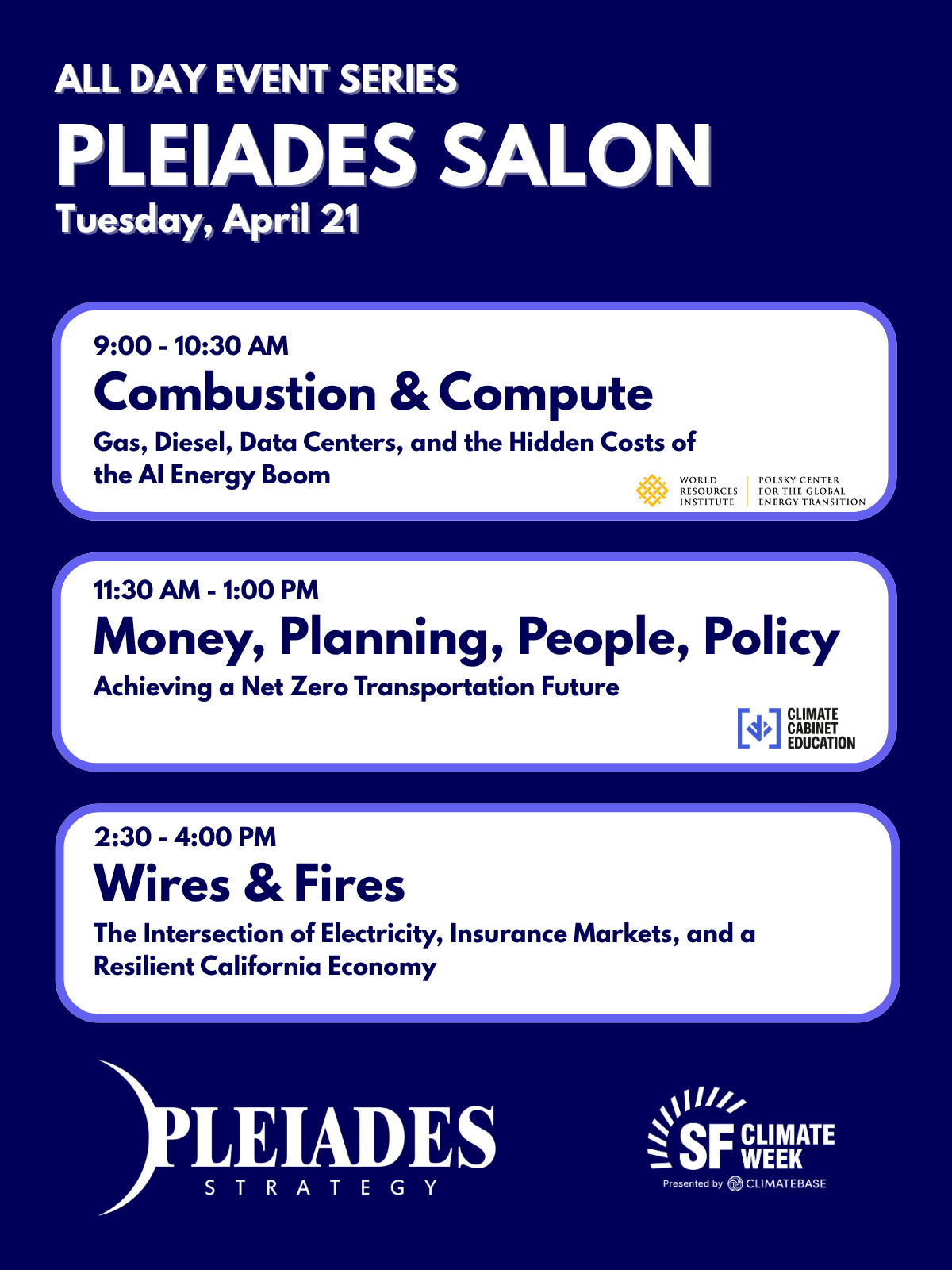 On April 21, Pleiades Strategy is hosting a full day of conversations at SF Climate Week with some of our favorite thinkers and doers digging into topics that deeply matter — the Pleiades Salon. Three conversations, one through-line: the places where climate risk, the energy transition, infrastructure, and policy collide in ways that demand our collective attention.