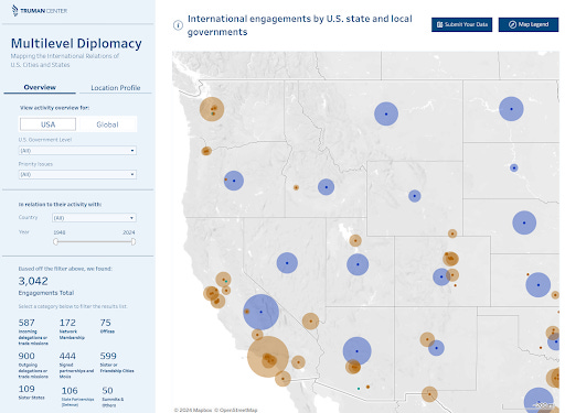 The Truman Center’s new Multilevel Diplomacy visualization tool shows the scale of their international coordination on key issues of the day — and a quick tour of the US shows that climate and innovation are leading collaboration drivers.